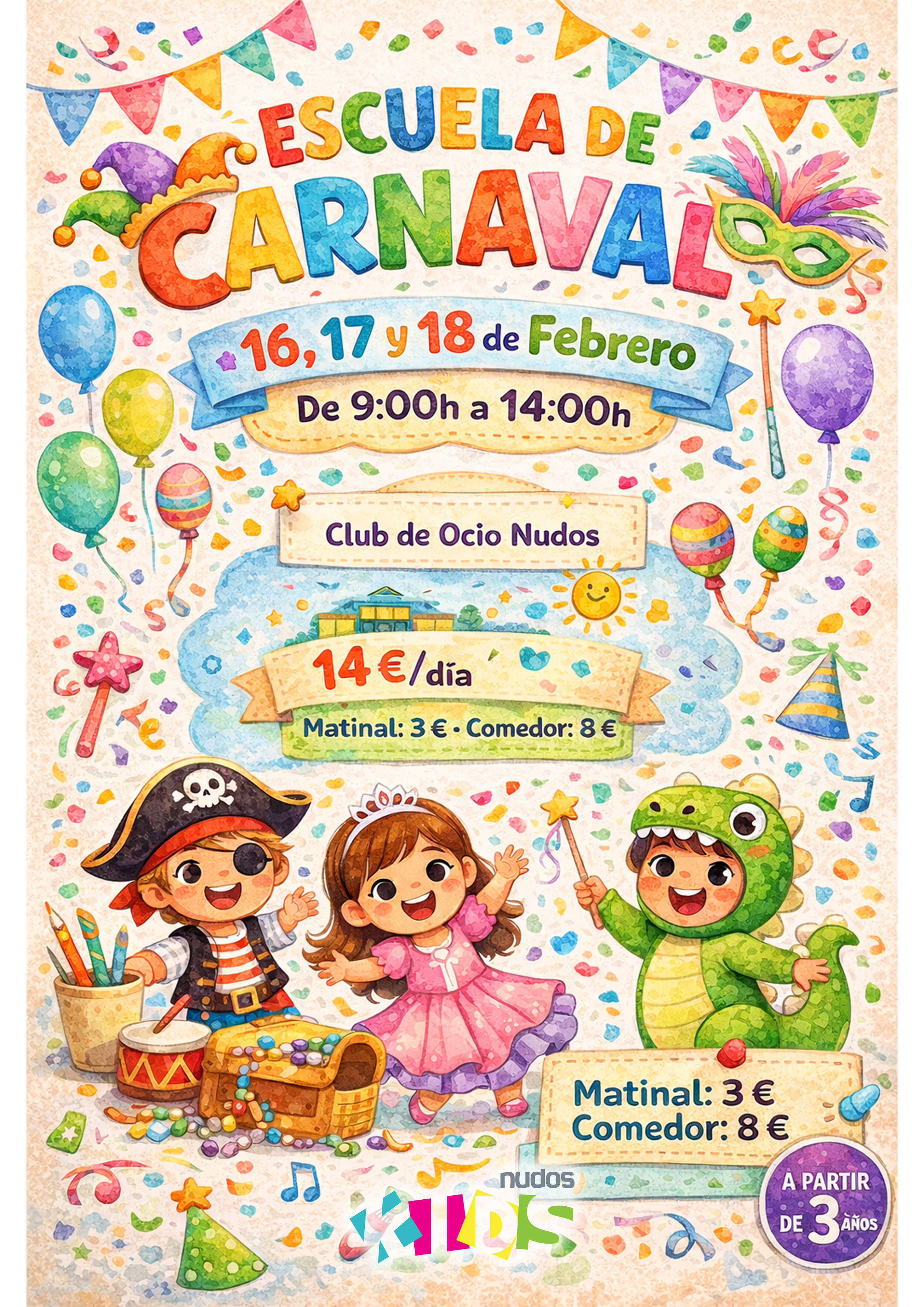 El día 7 de Febrero, celebraremos en la ludoteca NUDOSKIDS un divertido taller de carnaval. Disfraces, sorpresas y mucho mas!! Incluye cena y minidisco Te apuntas? INFO Y RESERVAS EN EL 639 611 204