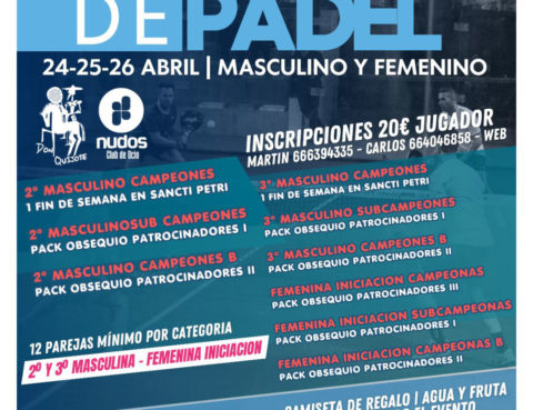 ¡Vuelve la competición a Club de Ocio Nudos con un torneo que no te puedes perder! 24, 25 y 26 de abril Categorías masculino y femenino Inscripción: 20€ por jugador Todos los participantes recibirán: Camiseta de regalo Agua y fruta durante todo el evento Premios destacados: Fin de semana en Sancti Petri Packs regalo de…