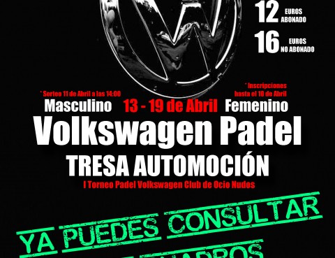 Club de Ocio Nudos les presenta nuestro próximo evento: TORNEO PADEL VOLKSWAGEN – TRESA AUTOMOCIÓN, del 13 al 19 de abril. ¡YA PUEDES CONSULTAR LOS CUADROS DEL TORNEO! Cuadro categoría masculina Cuadro categoría femenina Cuadro consolación masculina Cuadro consolación femenina REGLAMENTO